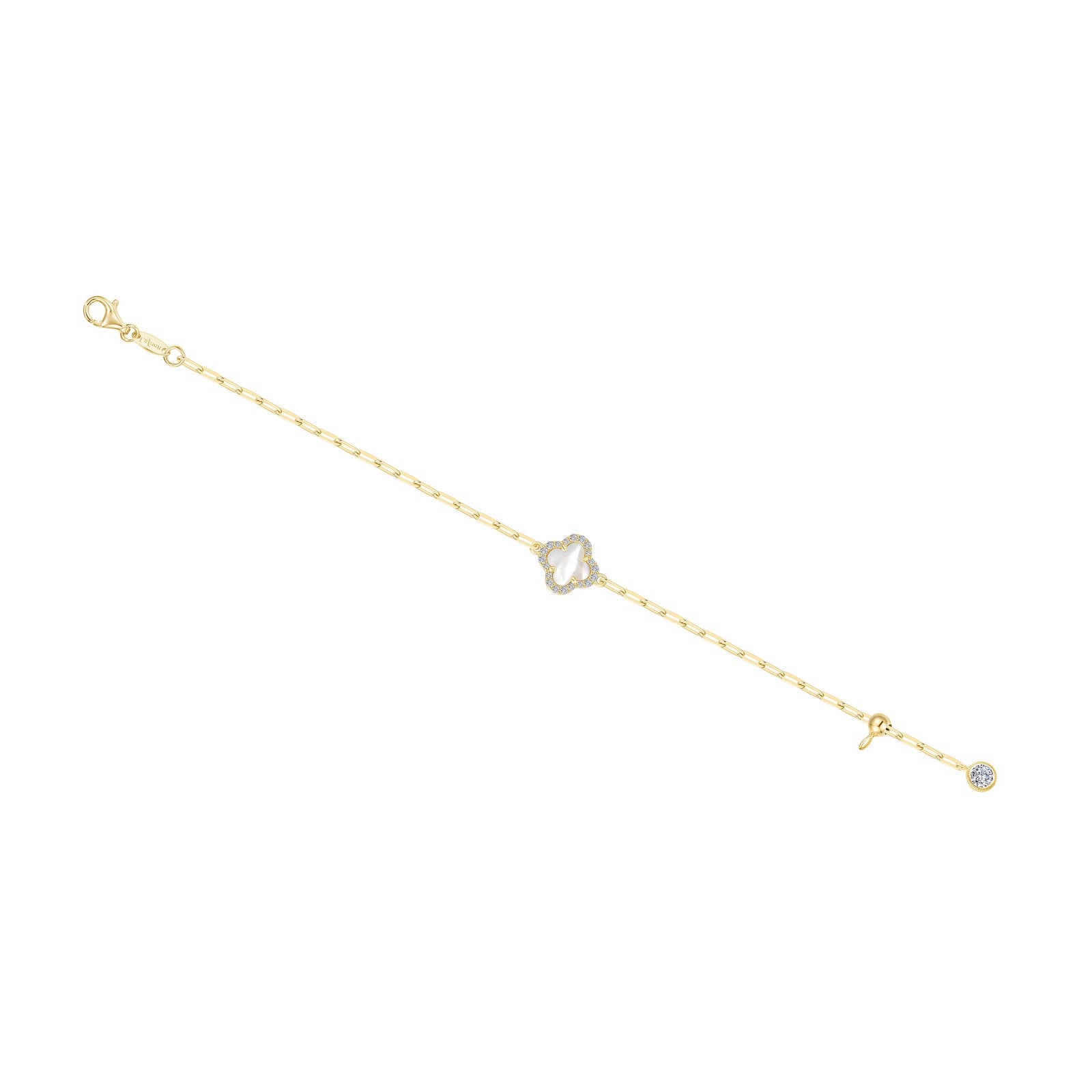 Delicate and graceful. This bracelet features a cultured freshwater mother-of-pearl clover motif on a paperclip chain. Perfect for layering or wearing solo as a subtle statement. Set with Lafonn's signature Lassaire simulated diamonds in sterling silver plated with gold.