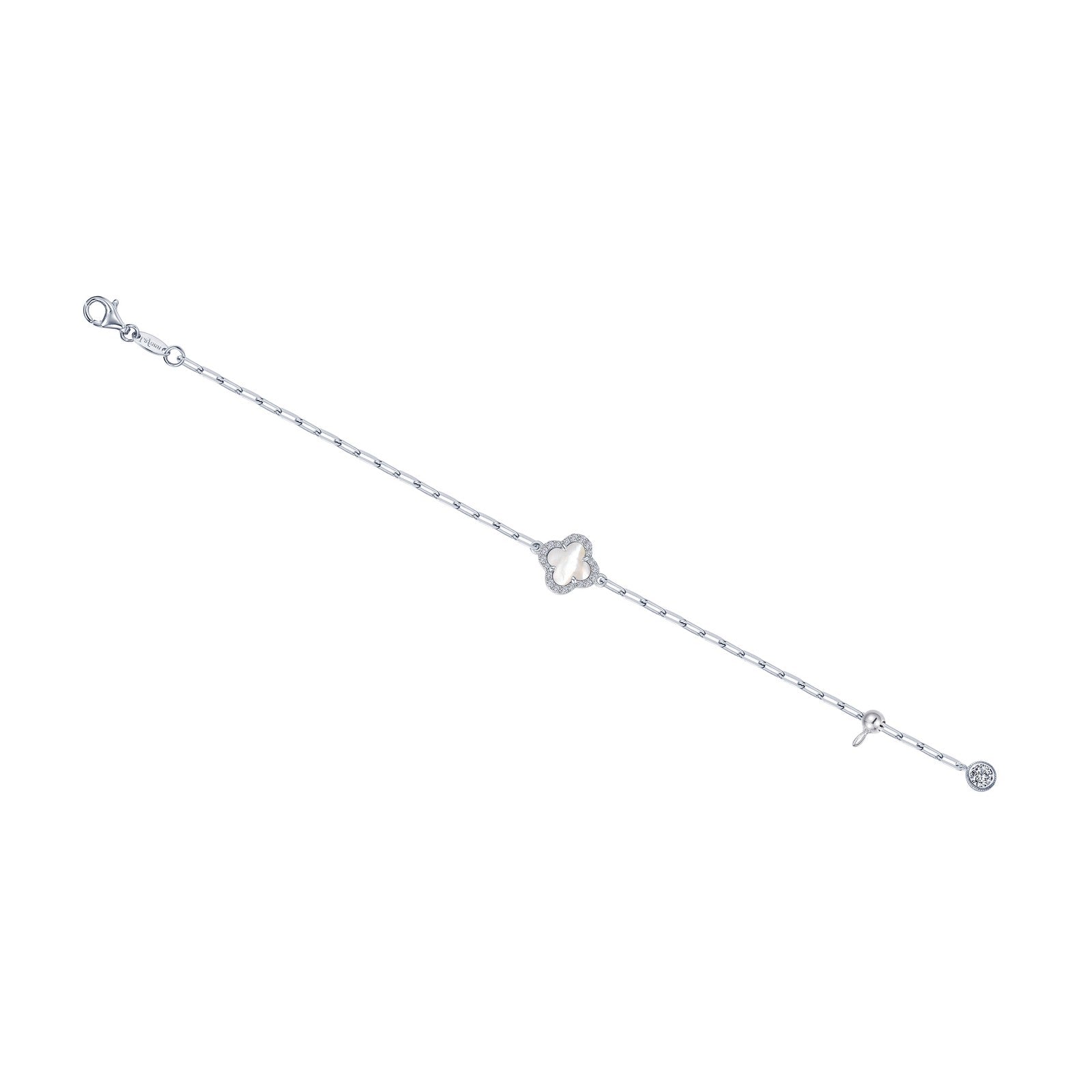 Delicate and graceful. This bracelet features a cultured freshwater mother-of-pearl clover motif on a paperclip chain. Perfect for layering or wearing solo as a subtle statement. Set with Lafonn's signature Lassaire simulated diamonds in sterling silver bonded with platinum.