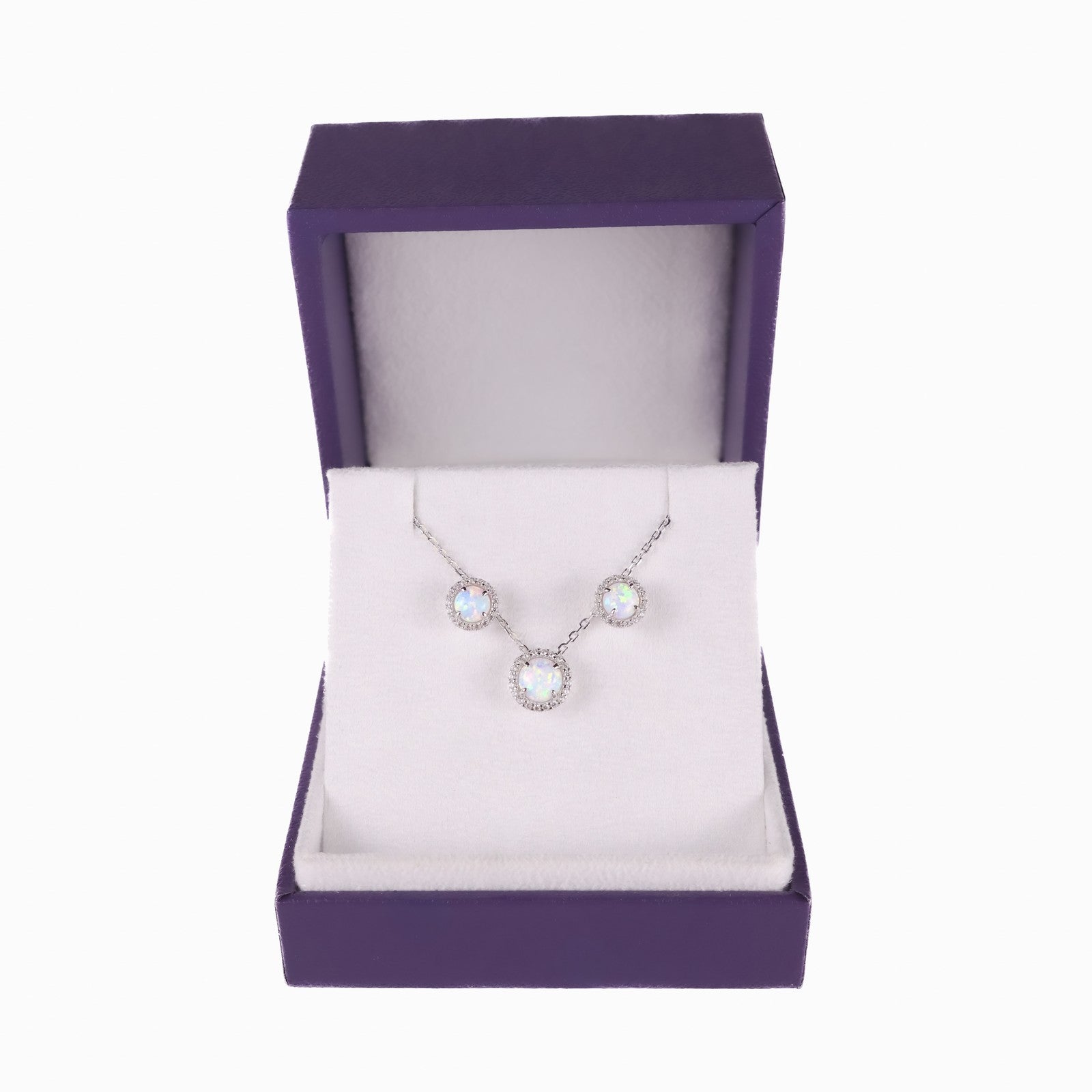 The BTH25OPPHL Special includes one pair of simulated opal halo stud earrings and a simulated opal necklace surrounded by Lafonn's signature Lassaire simulated diamonds in sterling silver bonded with platinum.