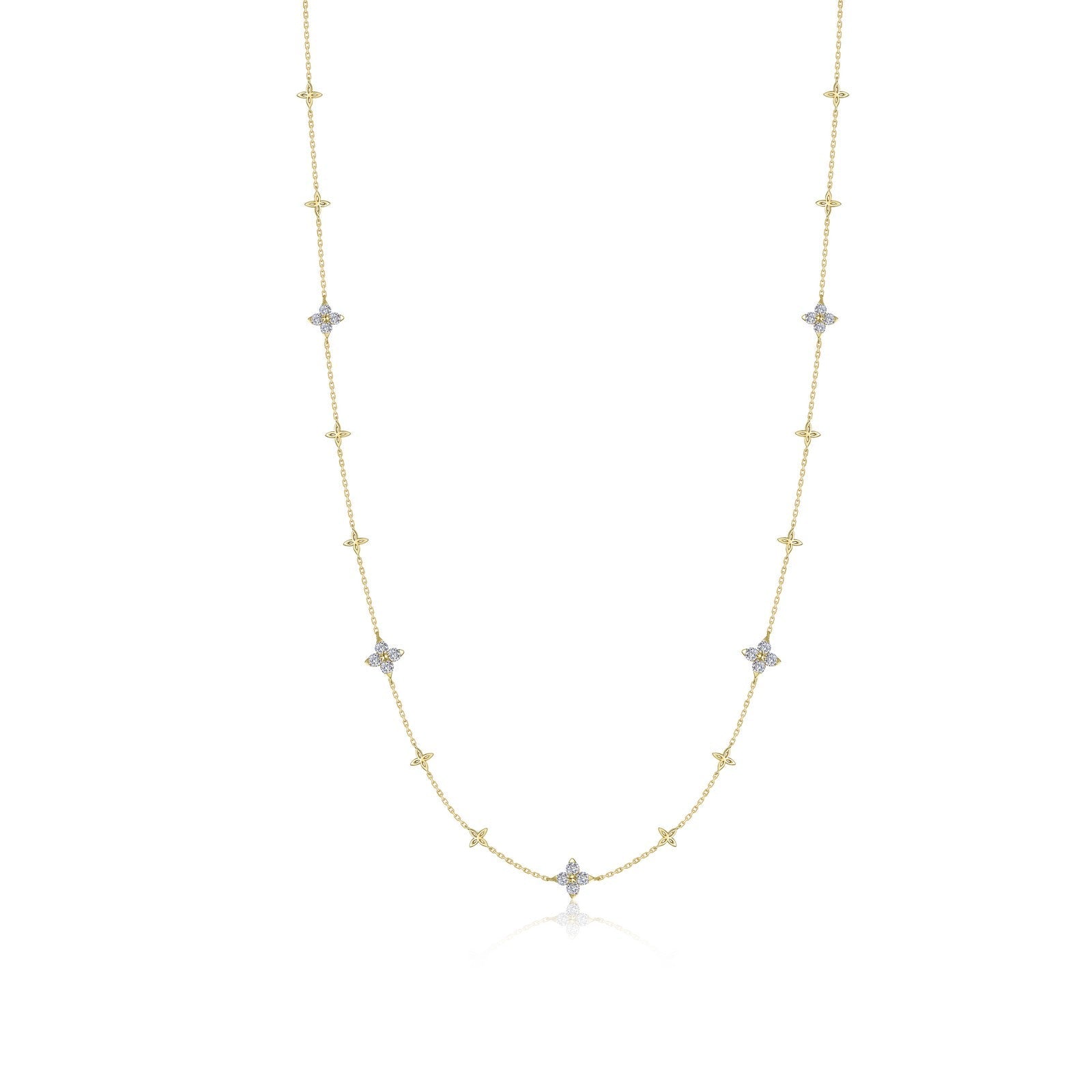 A garden of elegance. This flower-inspired design represents the powerful energy that brings forth new life. This necklace is the perfect blend of nature-inspired charm and refined luxury. Whether as a statement piece or a subtle accent, this necklace brings a timeless elegance to any occasion. Set with Lafonn's signature Lassaire simulated diamonds in sterling silver and finished with Lafonn’s exclusive TR Gold plating, a new and improved process that preserves the rich color of gold and enhances its brilliance.